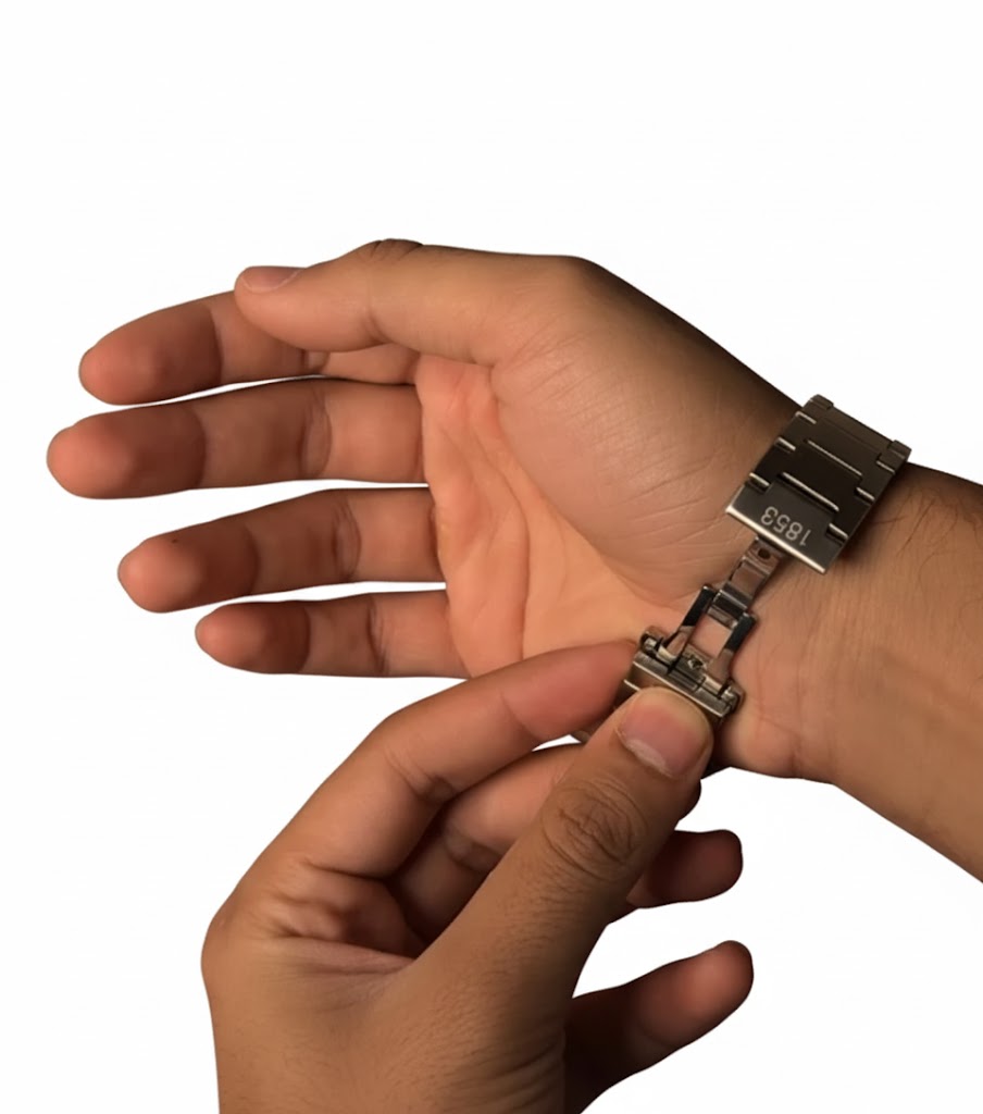 A sleek Swiss-made watch with a stainless steel case, integrated bracelet, sapphire crystal, and 100 m water resistance — perfect blend of vintage style and modern class.